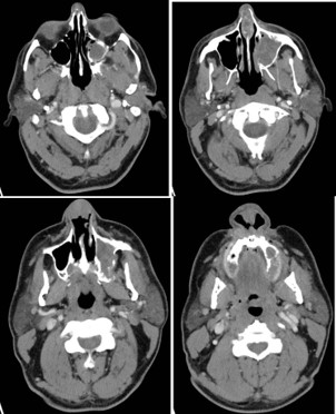 The ostiomeatal complexes were occluded bilaterally, and there was bowing of the nasal septum to the right (Figure 1). He was scheduled for an endoscopic evaluation under anesthesia with nasal biopsy and frozen section analysis. Intraoperatively patient was noted to have fungating masses within bilateral nasal cavities. Multiple biopsies were obtained showing invasive squamous cell carcinoma. The case was terminated and a CT neck with contrast was obtained for surgical planning.