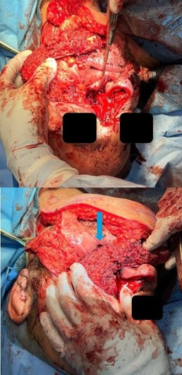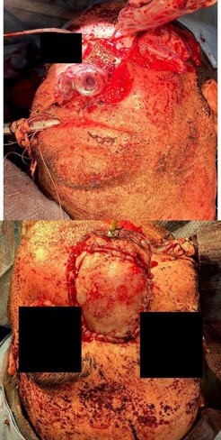 A chimeric scapular free flap was chosen for reconstruction because it provides multiple bony components and skin for reconstruction. A 10×2.5 cm segment of the lateral border of the scapula and entire scapular tip was harvested along with the subscapular muscle. The skin paddle obtained was parascapular. The two components of the flap were noted to have two separate arterial origins but shared venous drainage. The flap was then placed into the defect of the face. The bony aspect of the flap was utilized to reconstruct the hard palate and maxillary defect with osteotomies (Figure 3). Proximal scapular bone was plated to the residual hard palate and distal portion to the anterior maxillary process. Two nasal trumpets were placed through bilateral nasal vestibules. The middle portion of the skin paddle was de-epithelialized and used to pack into the nasal cavity. Medpor supported the left orbital contents and was secured to the scapular tip. The scapular tip was affixed to the left zygoma and frontal bone with a reconstruction plate. Then, titanium mesh was used for the nasal bony defect, and the skin paddle’s distal end covered it entirely (Figure 4). The microvascular anastomosis was then performed, drains and nasogastric tube were placed, and incisions were closed. The patient was admitted to the intensive care unit, where hourly flap perfusion checks were performed using a Cook arterial monitoring probe. The patient followed an uncomplicated post-operative course, with discharge on the seventh day.
