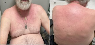 The patient described his neck pain as constant, burning type, radiating down towards bilateral shoulder joint and aggravated by any movement. He denied recent trauma, morning stiffness, upper extremity weakness, fever or any recent change in medications. The neck pain did not improve with ibuprofen. Concurrently, he noticed erythematous, non-pruritic rash in anterior neck and chest, which eventually spread to his upper back (Figure 1A & 1B). He attributed his symptoms to prolonged involvement in berry picking 2 weeks ago.