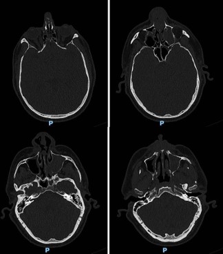 A 52-year-old male initially presented to the clinic for an evaluation of his nose. He had been suffering from nasal obstruction, rhinorrhea, anosmia, epistaxis, and chronic sinusitis for the last 5 years. At the time of presentation, he reported a change in the external aspect of his nose. He was unable to undergo endoscopic evaluation at the time, secondary to pain. STAT CT sinus with stealth protocol was performed. This initial CT scan revealed an opacified left maxillary sinus, polyposis vs thickening, and a small amount of tissue in the left nasal cavity.