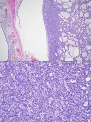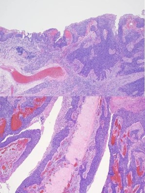 The patient was seen in an outpatient setting for a two week follow-up and discussion of final pathology results. These showed two masses: ameloblastoma with the invasion of the hard palate, posterior maxilla, and maxillary sinus (Figure 5) as well as a SCC with the cartilaginous and bony invasion of the nasal septum and nasal bone (Figure 6). During this clinic visit, he reported some discharge from one of the incisions and flap edema. He was otherwise doing well, with significant improvements in dysphagia and nasal obstruction. The flap adhered well to native tissue and appeared healthy. The infection cleared up over the next two weeks on a course of antibiotics, and the patient’s nasogastric tube was removed within the following three weeks.
